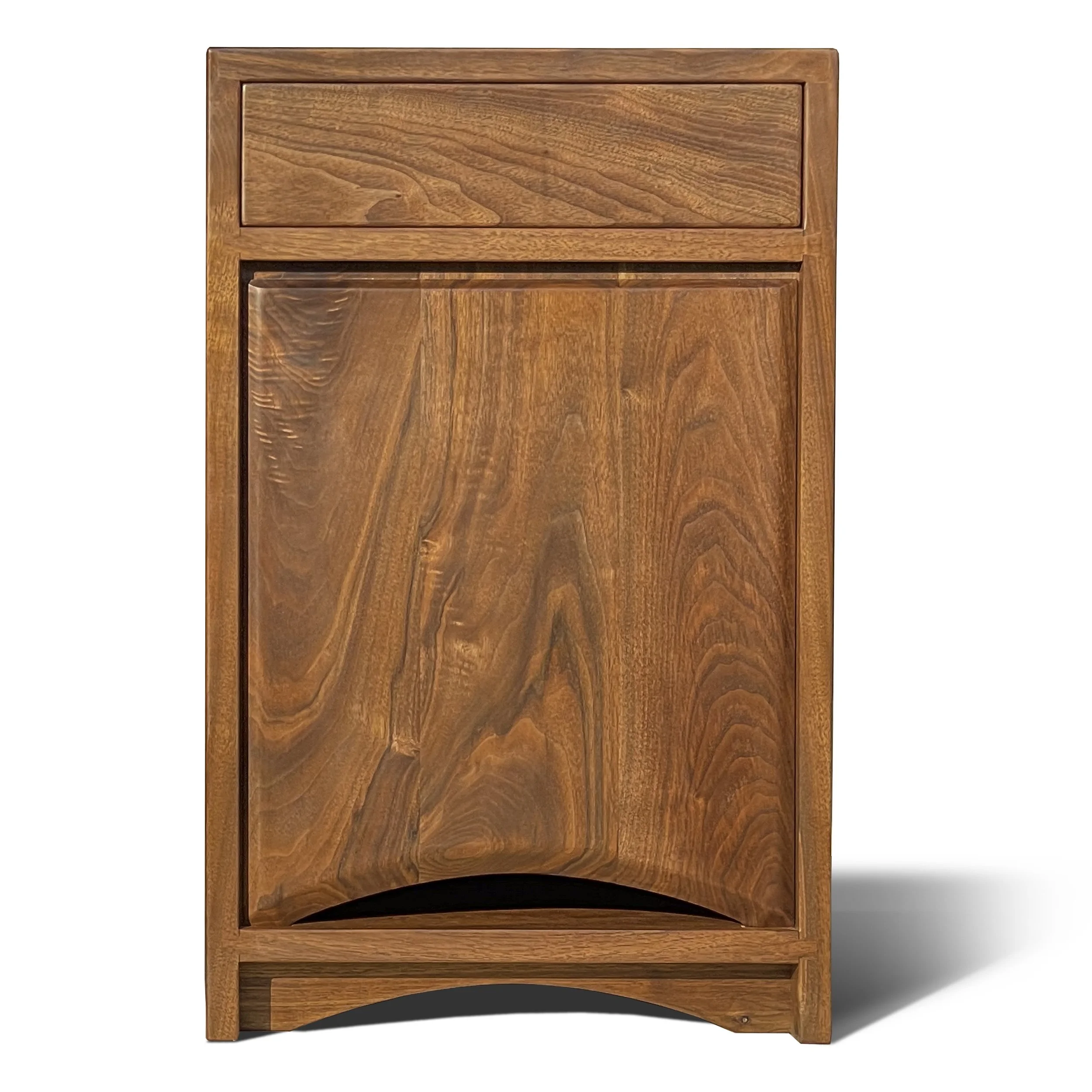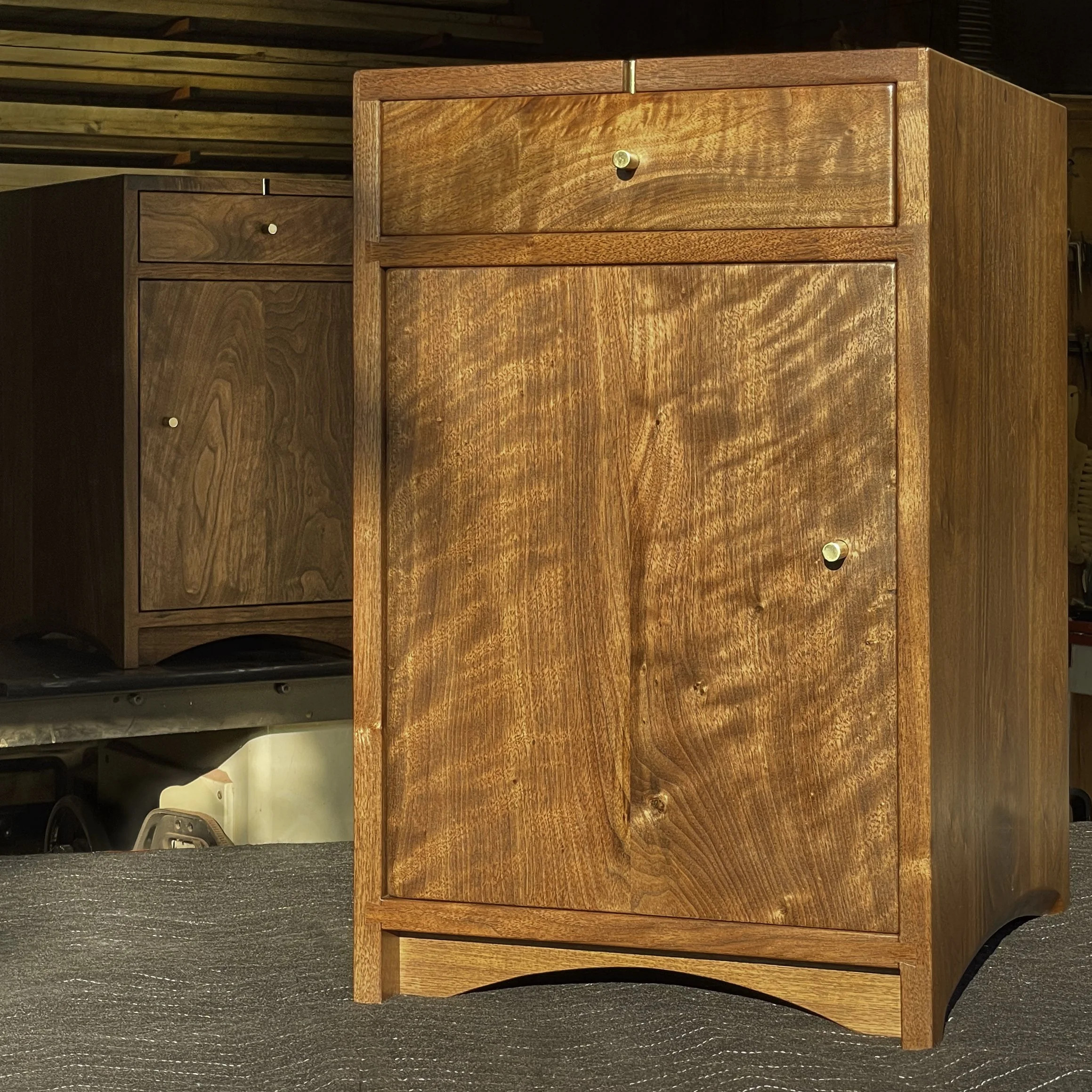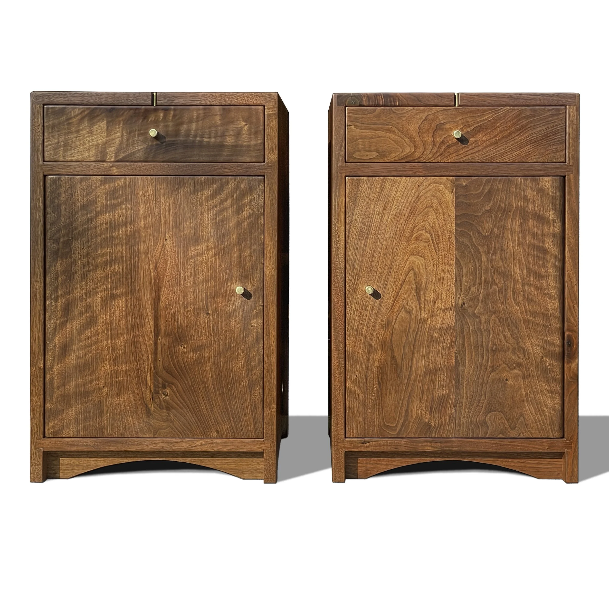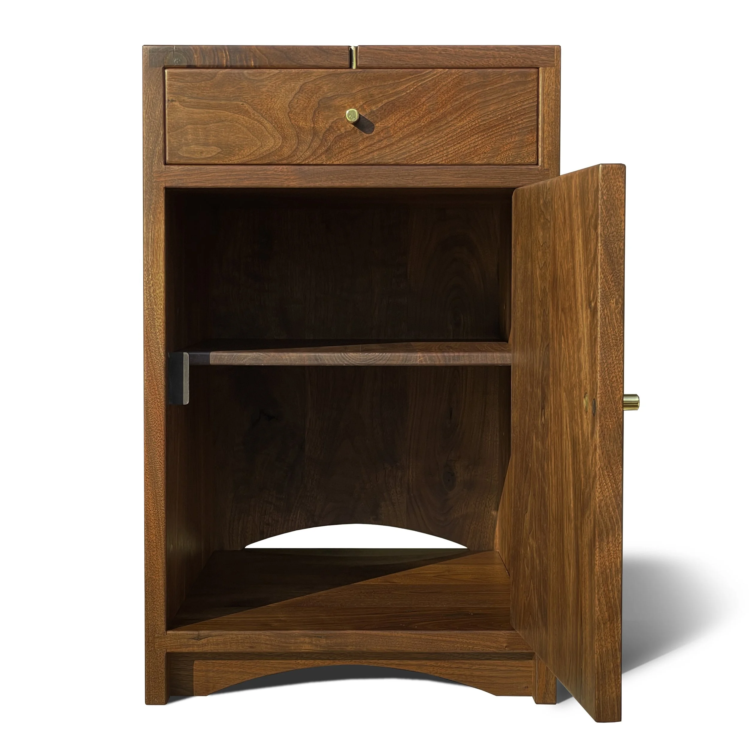 The nightstand’s lower storage features a singular shelf set on height-adjustable brass pins. The doors are secured shut by magnets and a soft leather cushion. A sculpted curved opening in the back of the case allows for cordage passthrough - And the passthrough can be widened slightly by simply raising the back panel which runs on a concealed track (also allowing for seasonal wood movement).