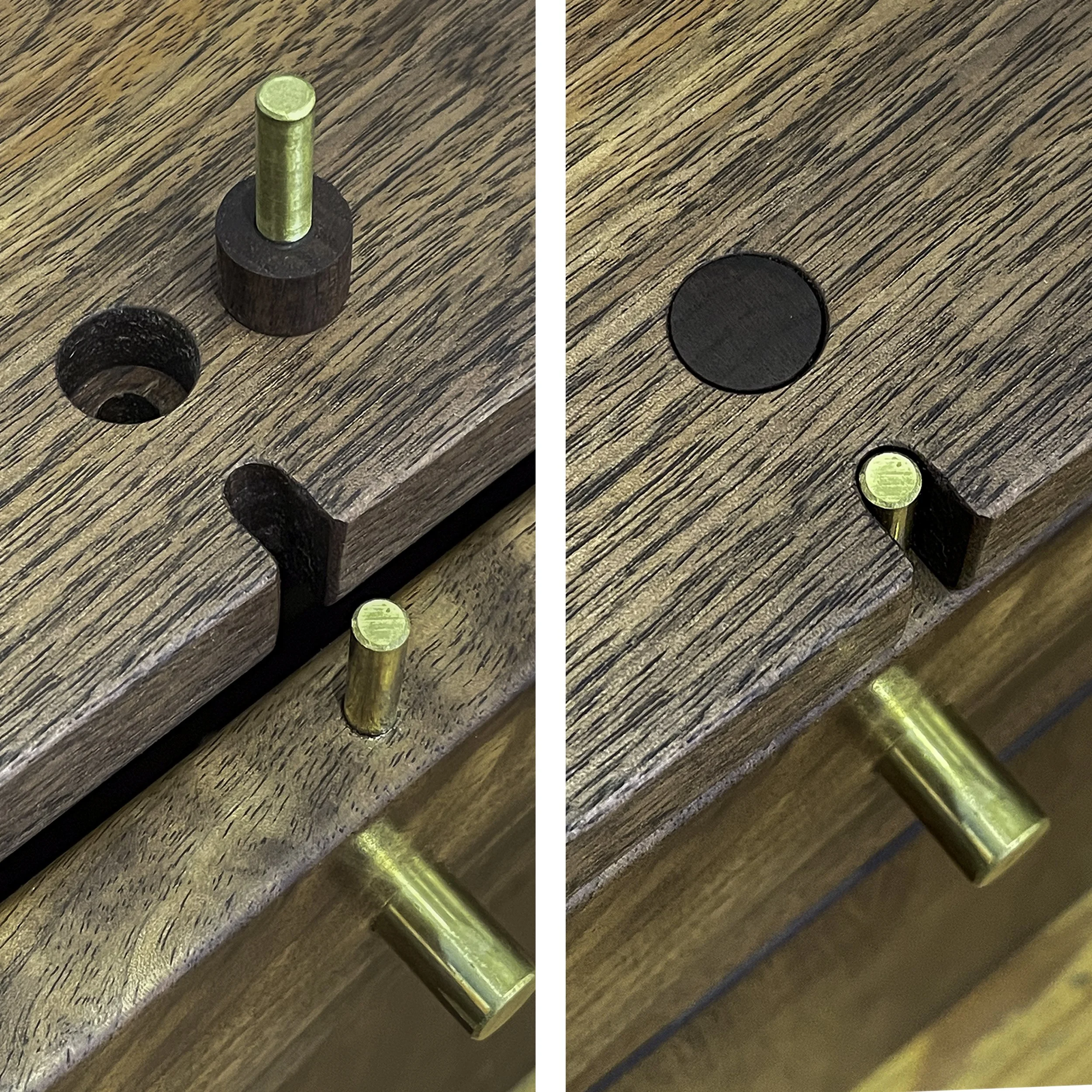 A combination walnut plug with brass pin serve as a thoughtful drawer catch. Each drawer is partitioned near the back so that when drawer is pulled out, the partitioned wall will contact the drawer catch first, thus concealing the hidden compartment.