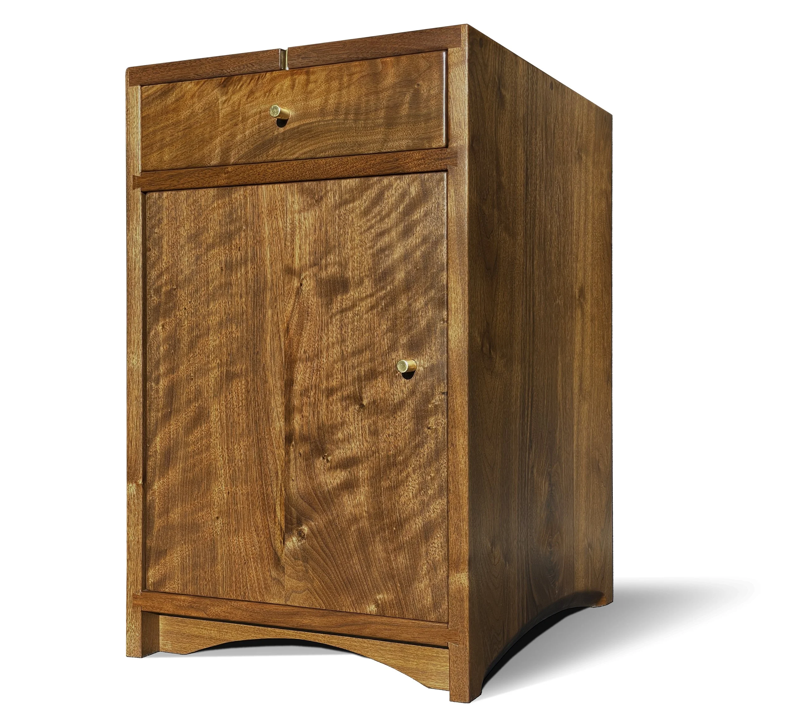 A modest design full of functional details and surprises. For upper storage, signature, hand-cut brass pulls and stops adorn the drawer fronts, and each drawer is hand-fit to its compartment.